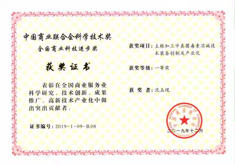 喜報傳來!在中國商業聯合會組織的2019年全國商業科技進步獎的評比中,魯山縣華豫萬通工程技術有限公司的糧食真菌毒素消除技術裝備生產項目榮獲一等獎,這是對華豫萬通多年來一直追求創新的一次積極肯定和極大的鼓勵。